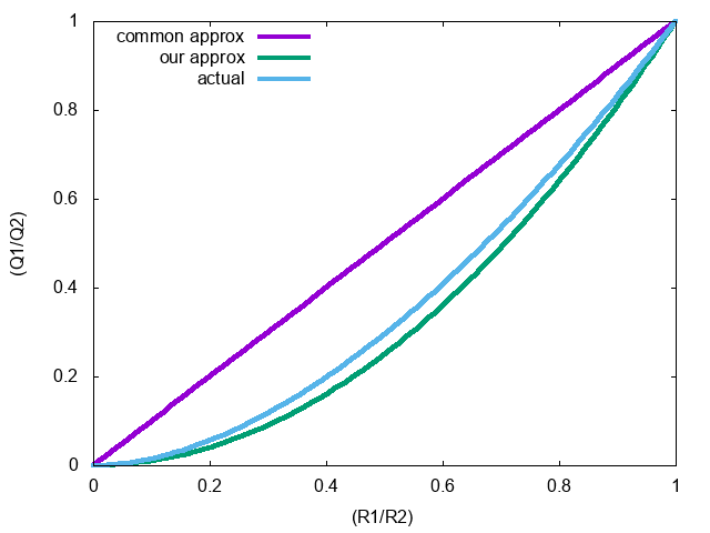 Actual \[ \frac{Q_1}{Q_2} = \left(\frac{R_1}{R_2}\right)^2 \left(\frac{\pi^2}{6} \right)^{(R_2-R_1)/(R_1+R_2)} \]