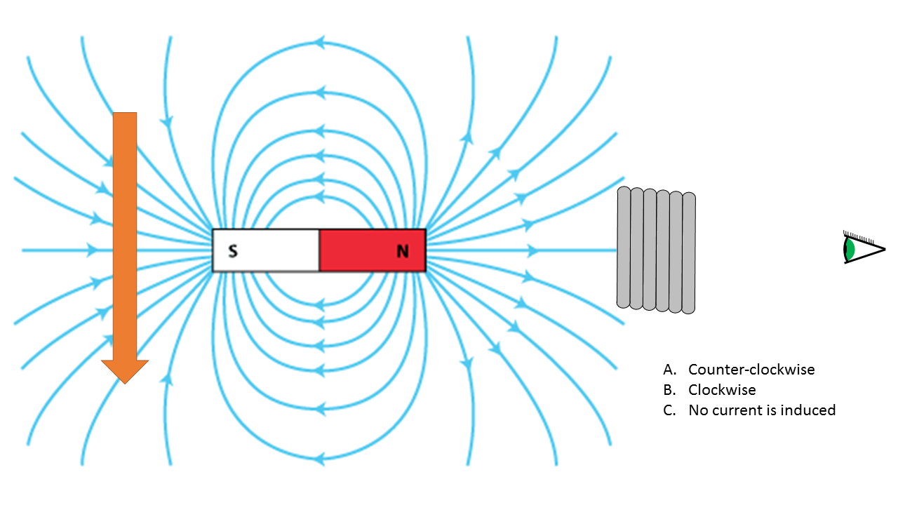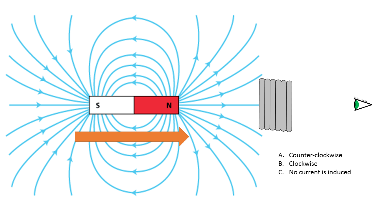 A current runs through coil A counterclockwise. If this decreases from 1 A to 0 A, what direction will the induced current in coil B flow?