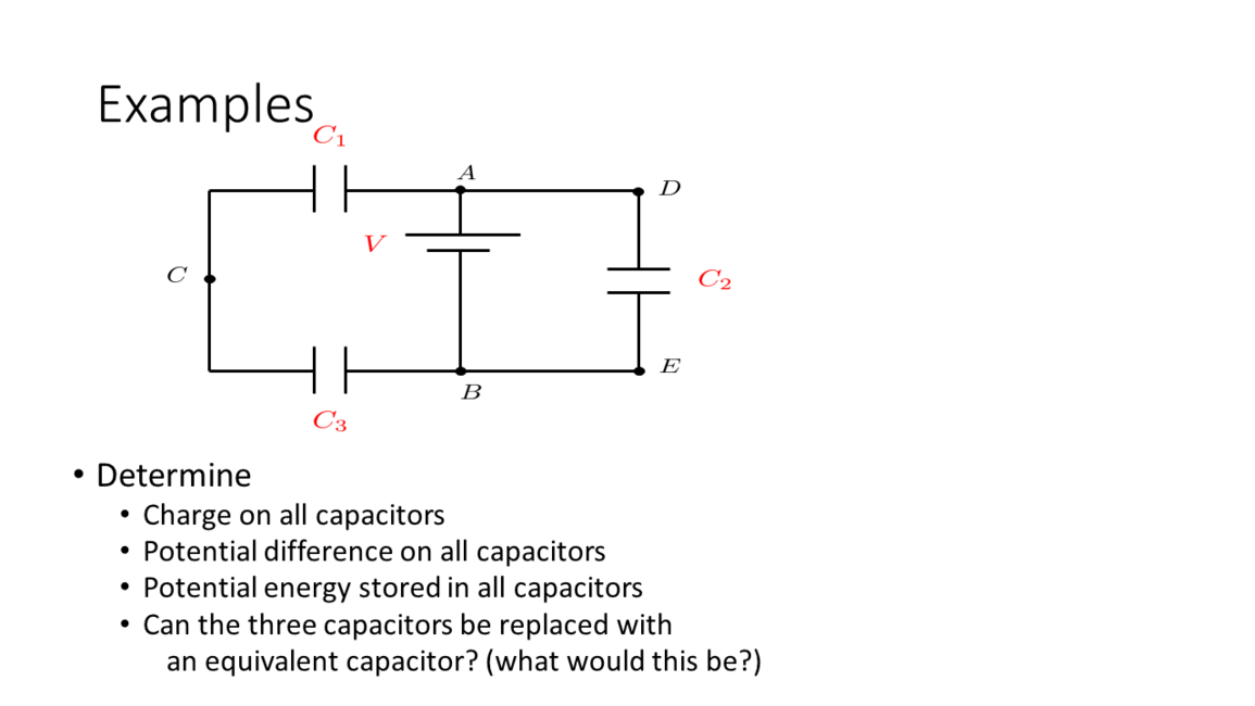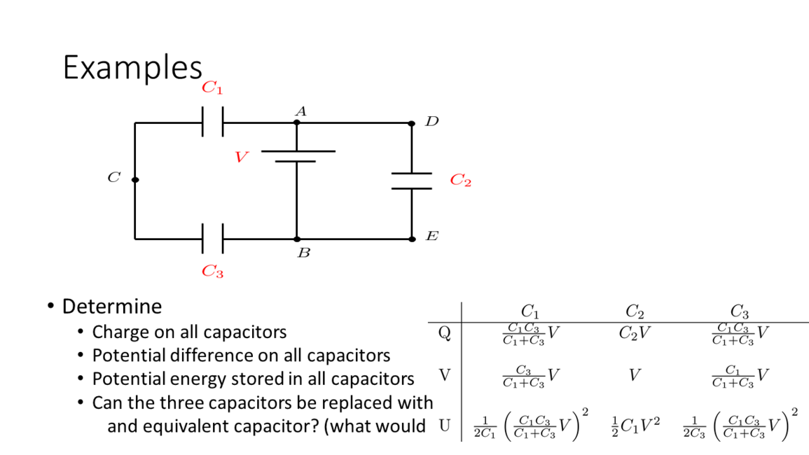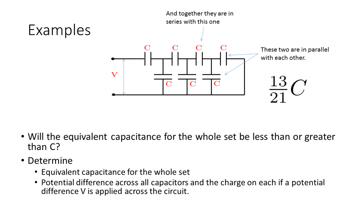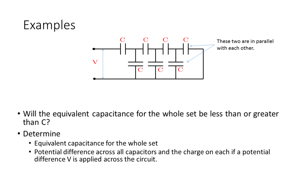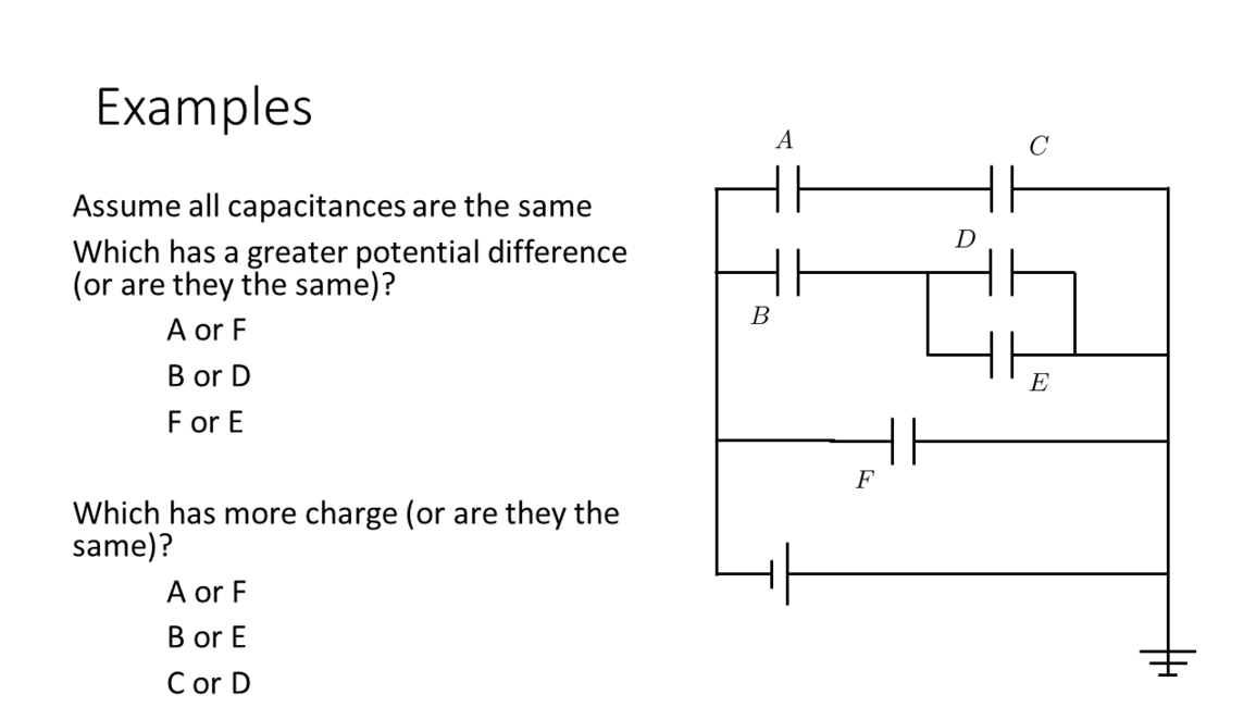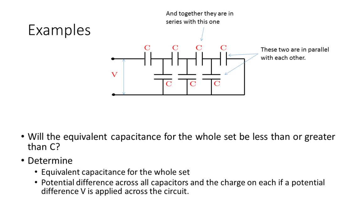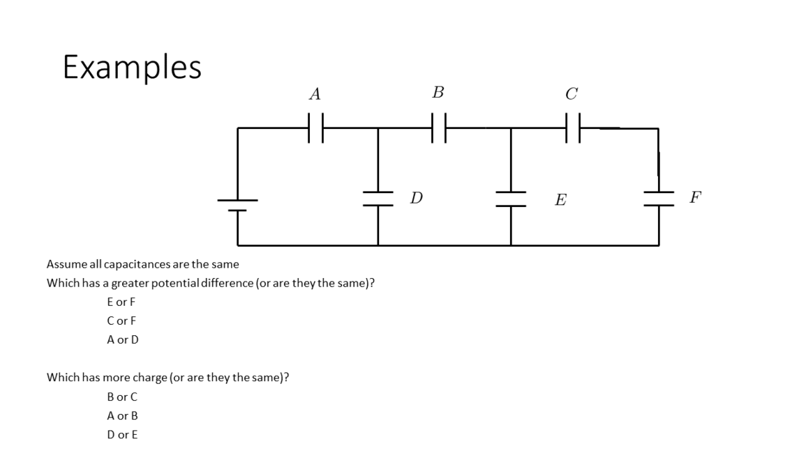 Assume that all capacitors are parallel plate capacitors, filled with air, with identical plates. If the voltage of the emf were slowly increased, which capacitor would reach its breakdown limit first?